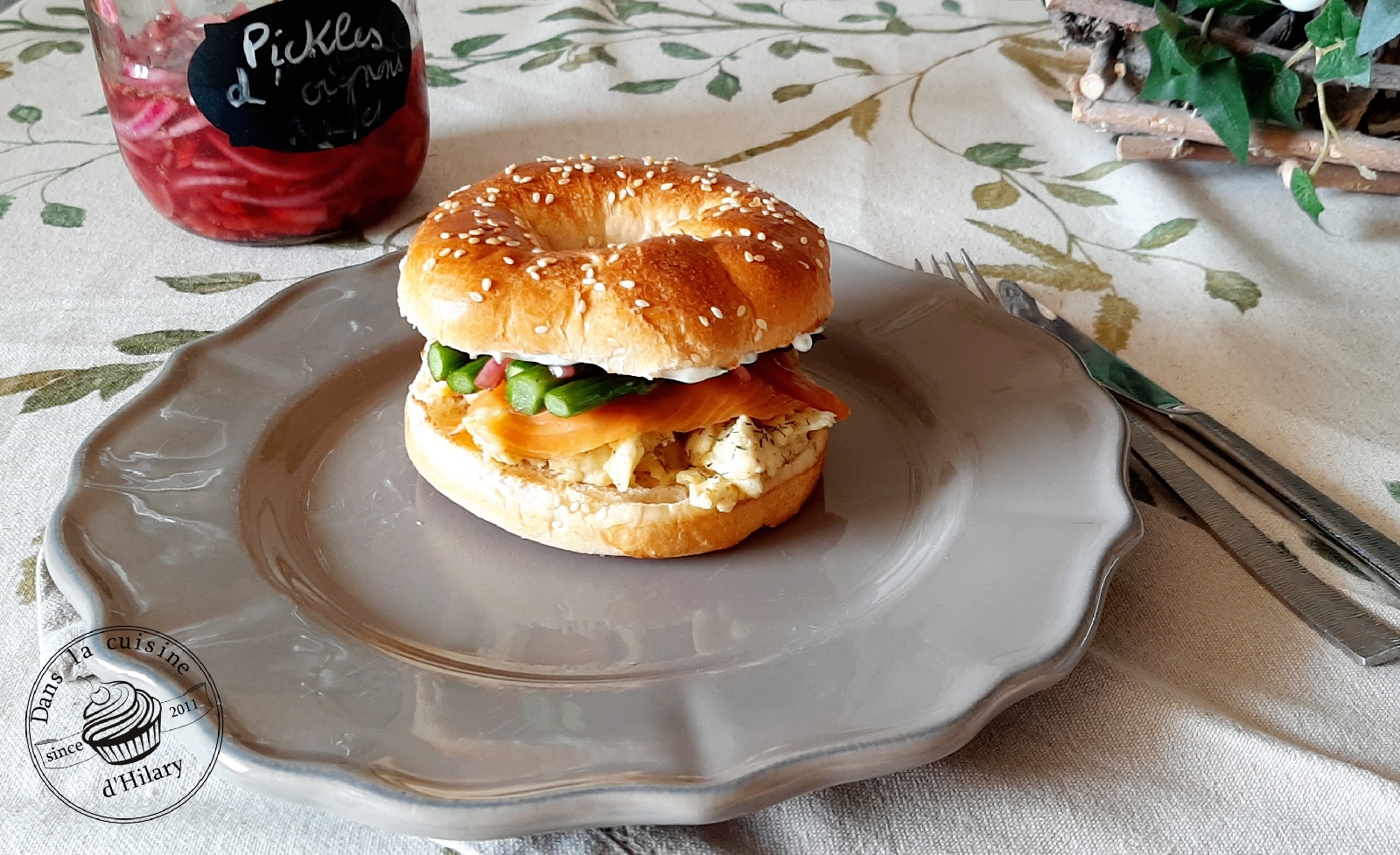 Placez les œufs brouillés sur le bas du bagel, surmontez de la tranche de truite fumée puis des morceaux d'asperges grillées et enfin de pickles d'oignon rouge. Fermez le bagel et dégustez chaud ou à température ambiante !